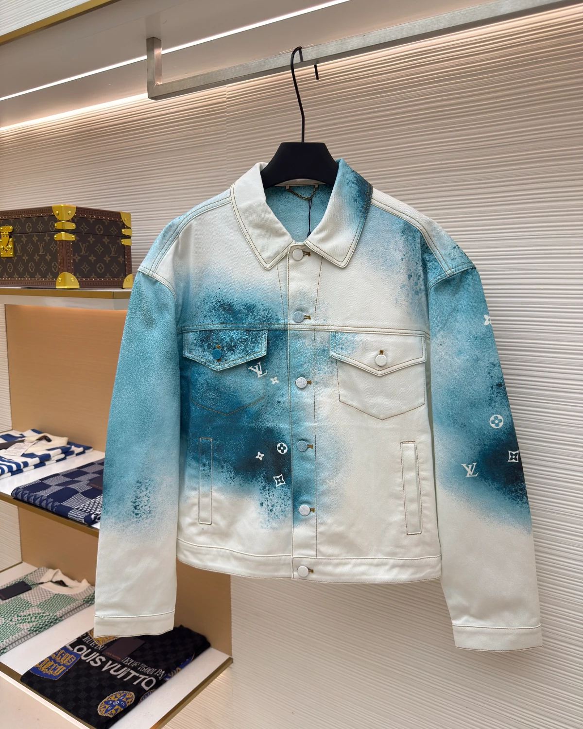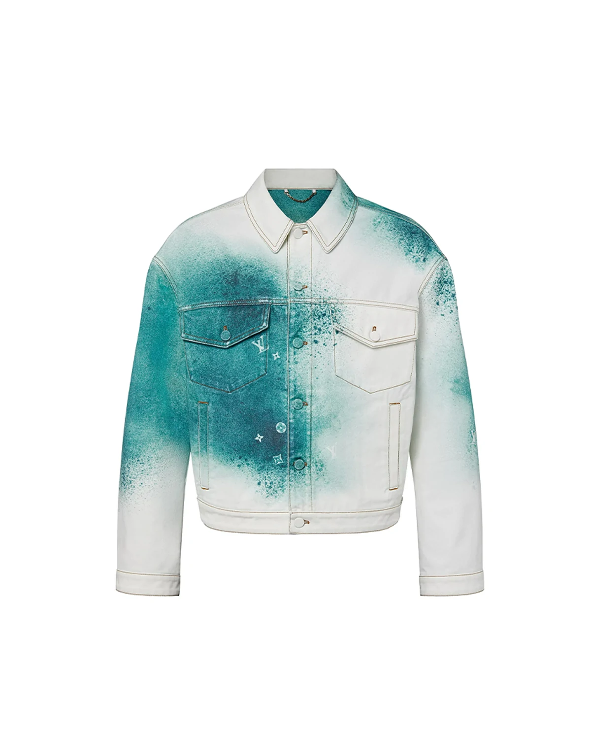This denim jacket is distinguished with a tie-dye-inspired LV Spray motif in a bright seasonal green, through which contrasting white Monogram signatures emerge.