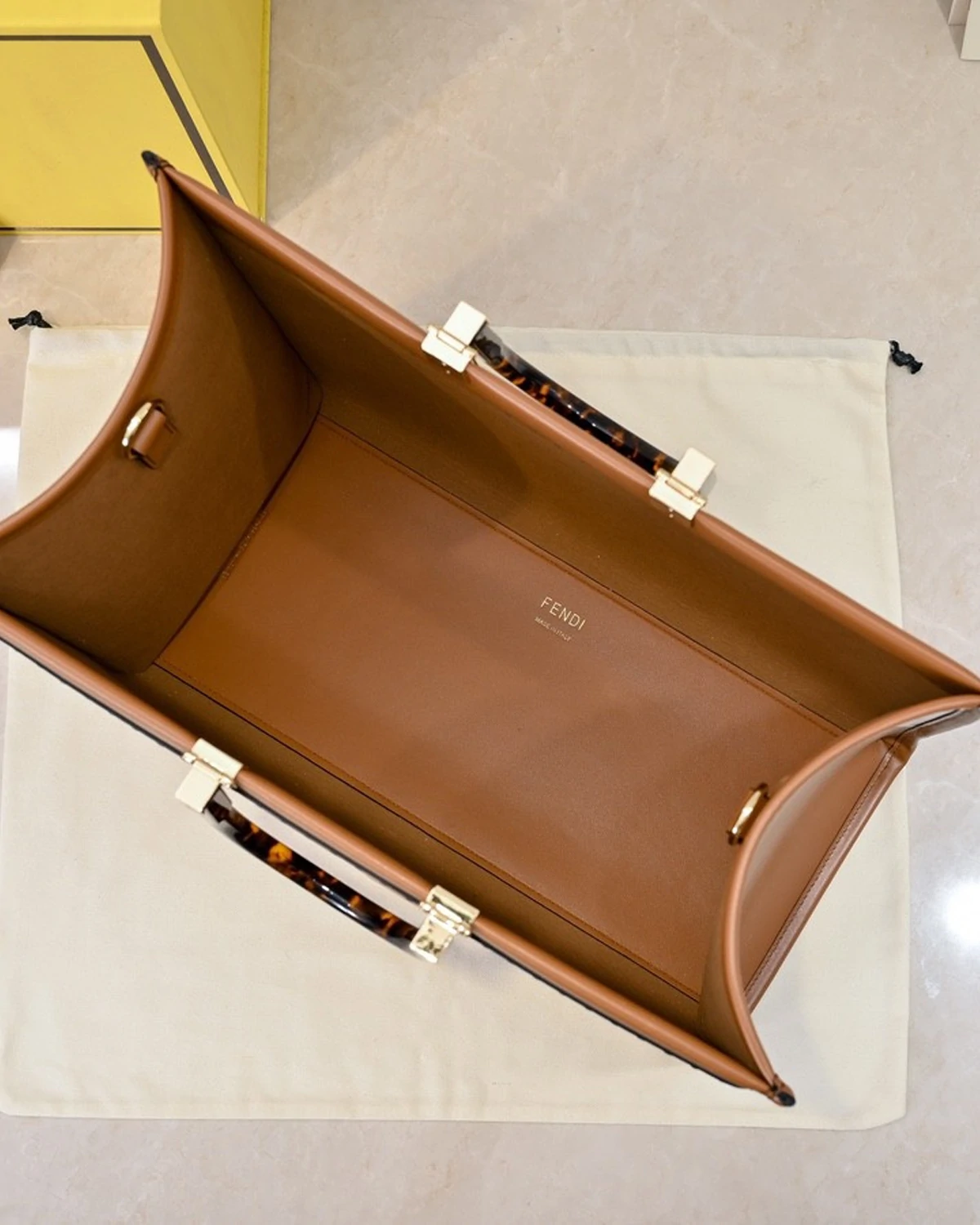A brown leather Sunshine tote bag adorned with a heat-printed “ROMA” pattern.The spacious interior is lined with Alcantara? and features gold-tone metal hardware.It can be carried by the tortoiseshell plastic glass handles or secured with a shoulder strap using two internal hooks.