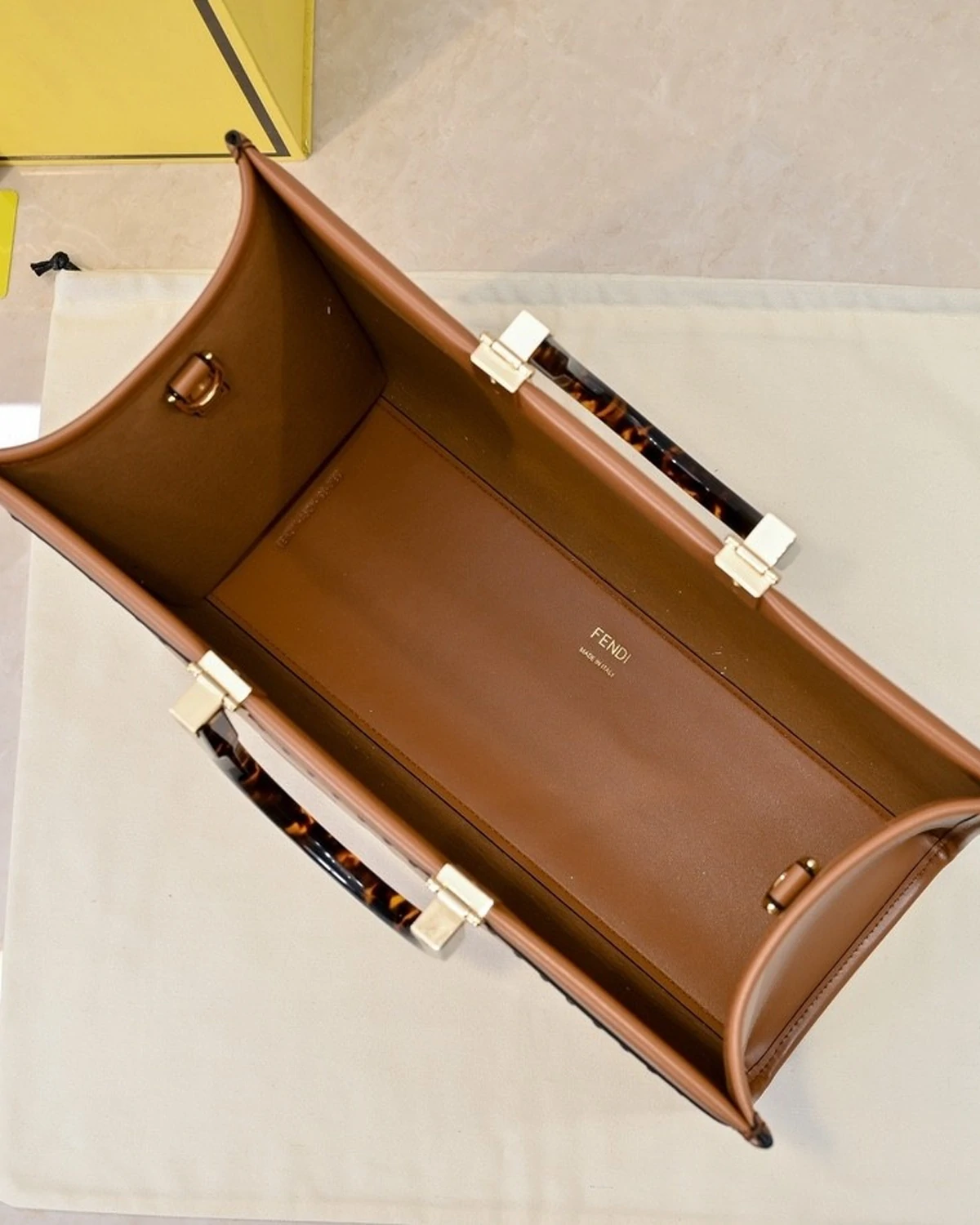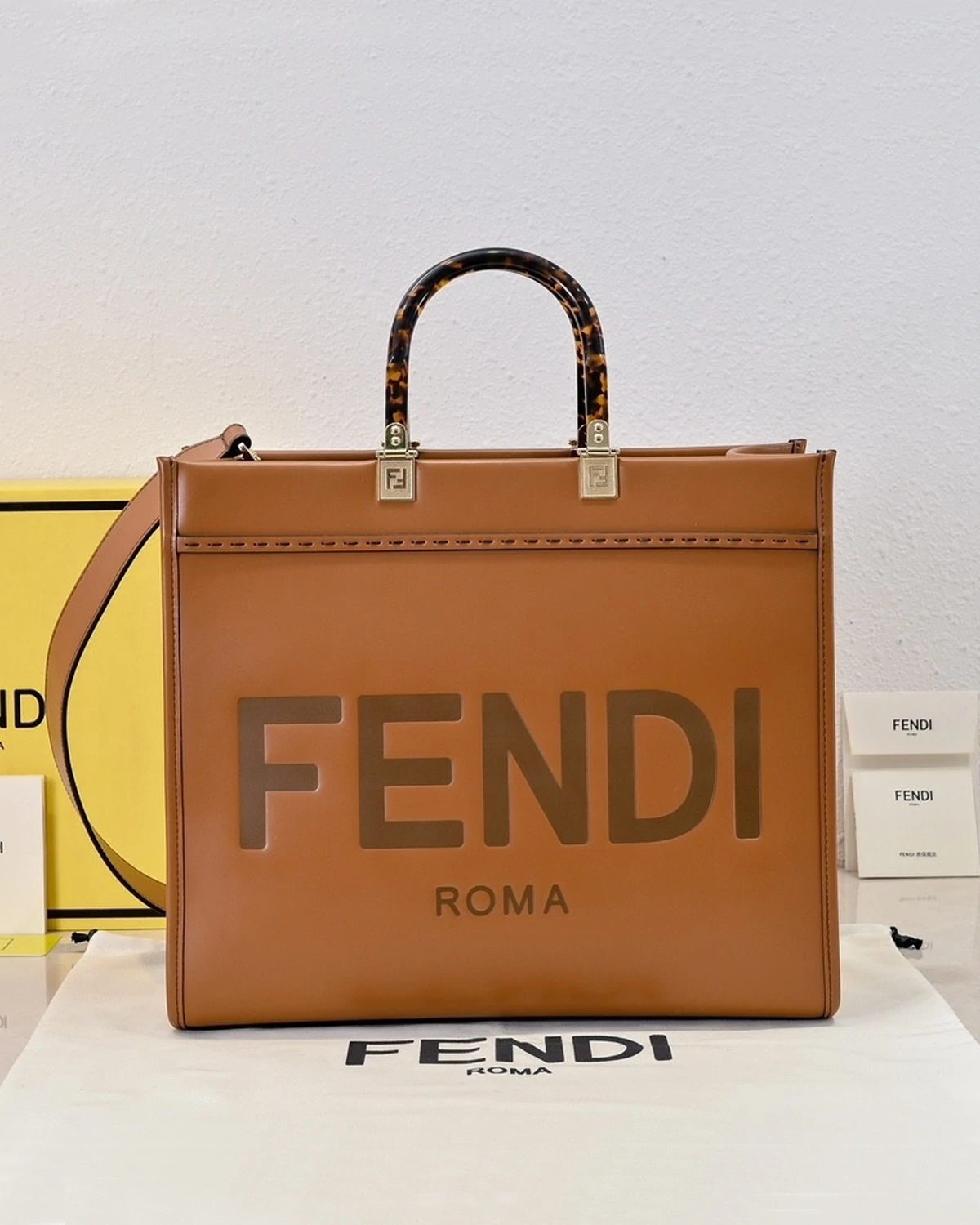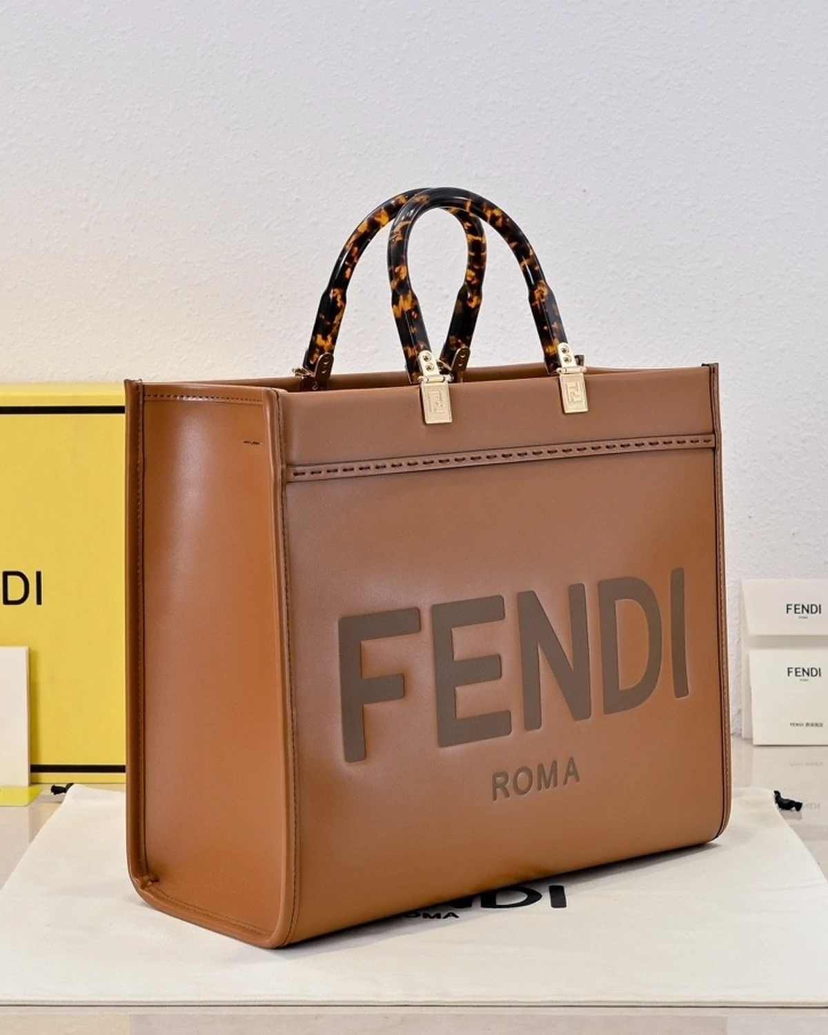 Medium Fendi Sunshine bag, a roomy, versatile city shopper distinguished by its linear design and sophisticated details.Made from brown calfskin with hot-stamped ??Roma?? and stiff plexiglass handles with a tortoiseshell effect.Features a spacious lined internal compartment, edges in tone-on-tone leather, and gold-finish metalware.Can be carried by hand or worn on the shoulder thanks to the two handles and detachable shoulder strap.
