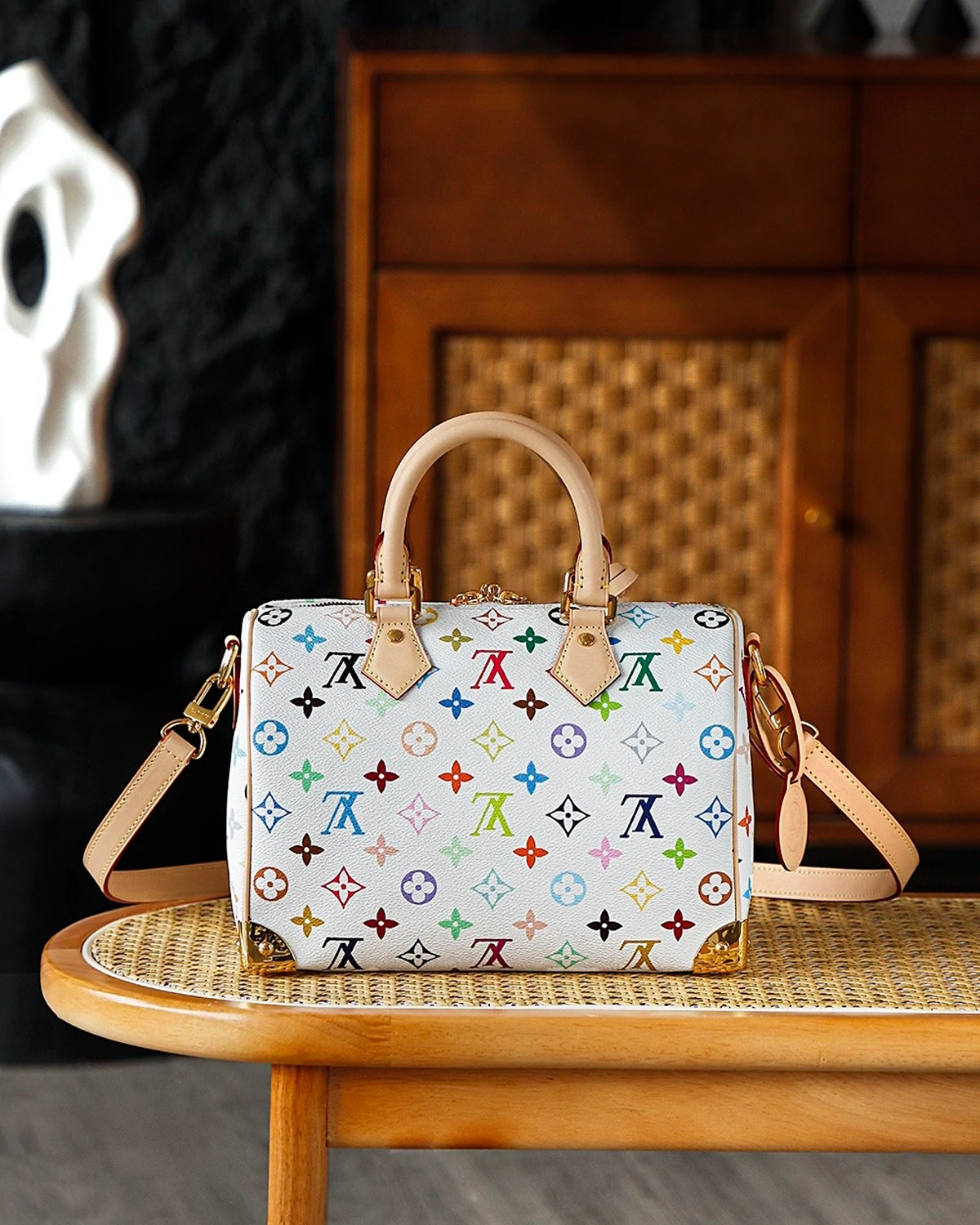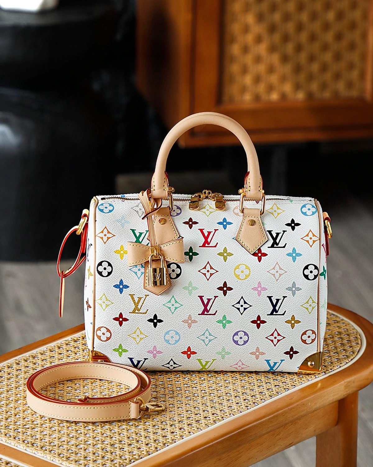 The Speedy Bandouli??re 25 bag exudes vibrant personality, embellished with the vibrant Monogram motif from the Murakami collaboration, reinterpreted in the Japanese artist Takashi Murakami’s signature fashion-forward color palette. The bag’s timeless design features two Toron top handles crafted from natural cowhide leather, a detachable shoulder strap, and a playful bow-shaped TM key holder. The gold-tone padlock and corner guards pay homage to iconic trunks.