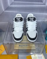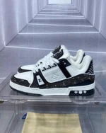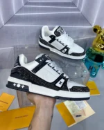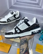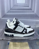 This fashionable LV Trainer sports shoes feature a patterned two-tone design, combining smooth calfskin and glittering Swarovski? crystals, making it distinctive. The classic style was designed by Virgil Abloh, the artistic director of Louis Vuitton, inspired by basketball shoes. The stylish sports shoes are known for their exaggerated structural upper and are adorned with rich details, including a two-tone rubber sole featuring Monogram floral patterns.