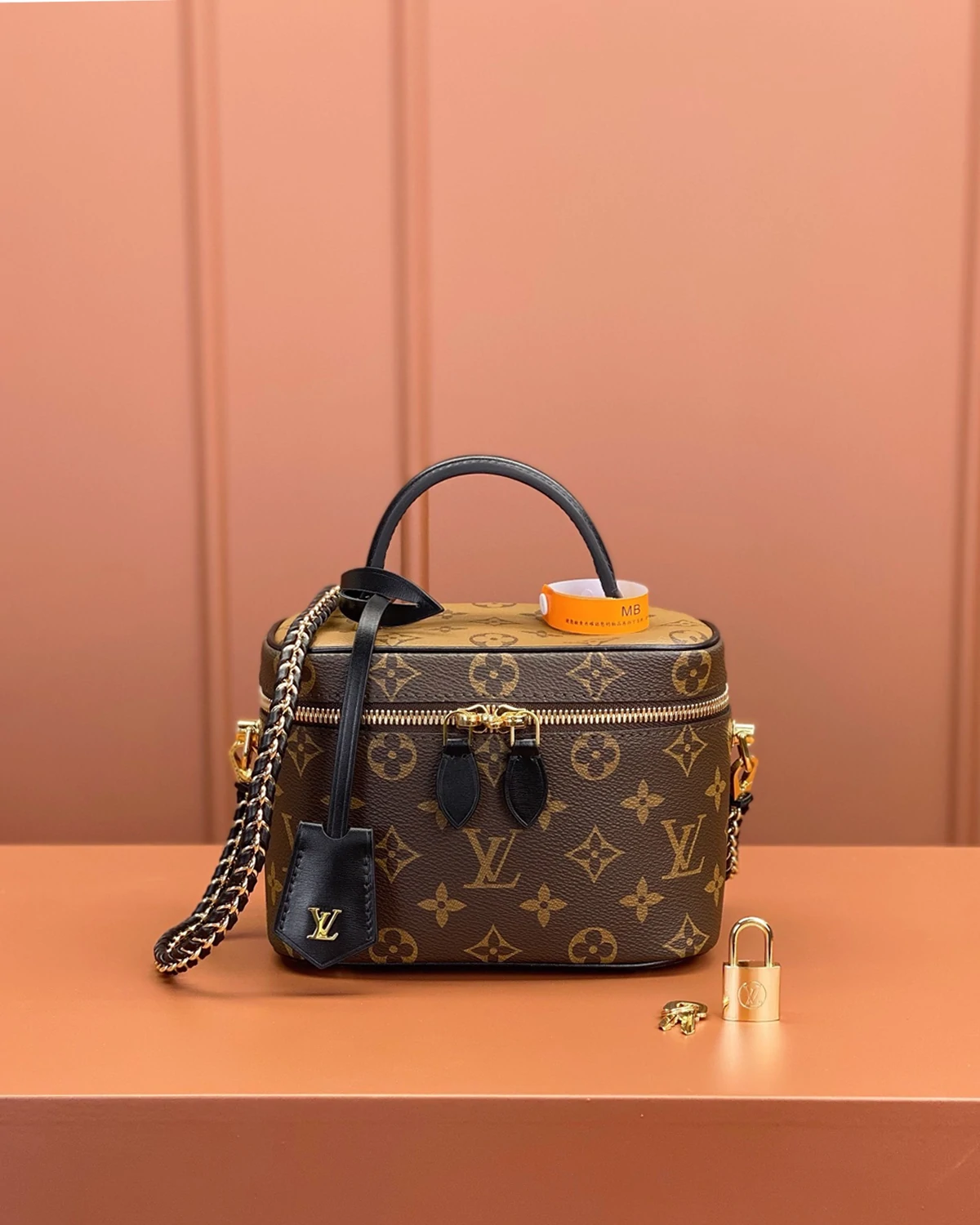 Nicolas Ghesqui??re reimagines Louis Vuitton’s travel heritage with a modern interpretation of the Nice vanity bag in Monogram and Monogram Reverse canvas. The soft and lightweight urban silhouette allows for effortless travel, while a detachable braided leather chain allows for easy carry, shoulder, or crossbody.