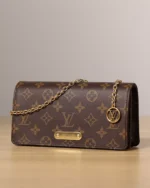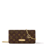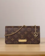 The Wallet On Chain Lily ??Monogram?? combines sleek sophistication with a touch of vintage flair. Crafted from iconic Monogram coated canvas, its rectangular silhouette is finished with a flap closure featuring a riveted gold-tone plate for an elegant retro accent.